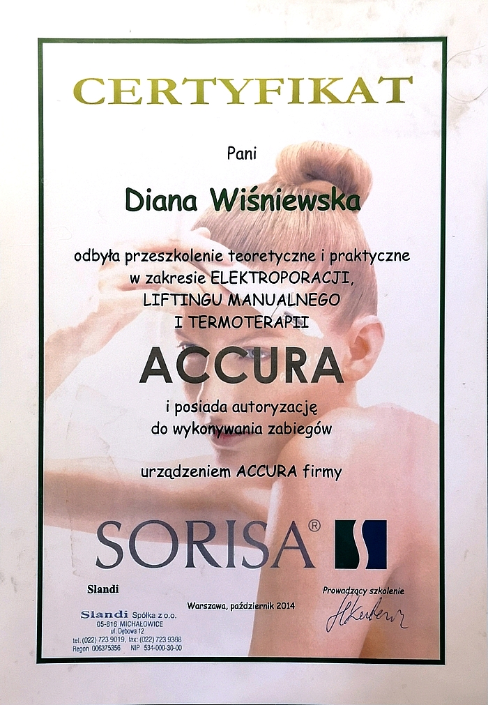 Diana Wiśniewska - 17 lat pracy w zawodzie. Po szkole medycznej w Moskwie. Odbyła szkolenia międzynarodowe.